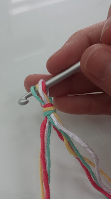 La segunda idea no es mucho más difícil que la primera. Se trata de hacer cadenetas pero esta vez con todos los hilos juntos. Yo he elegido 4 colores diferentes que me pegaban entre sí.