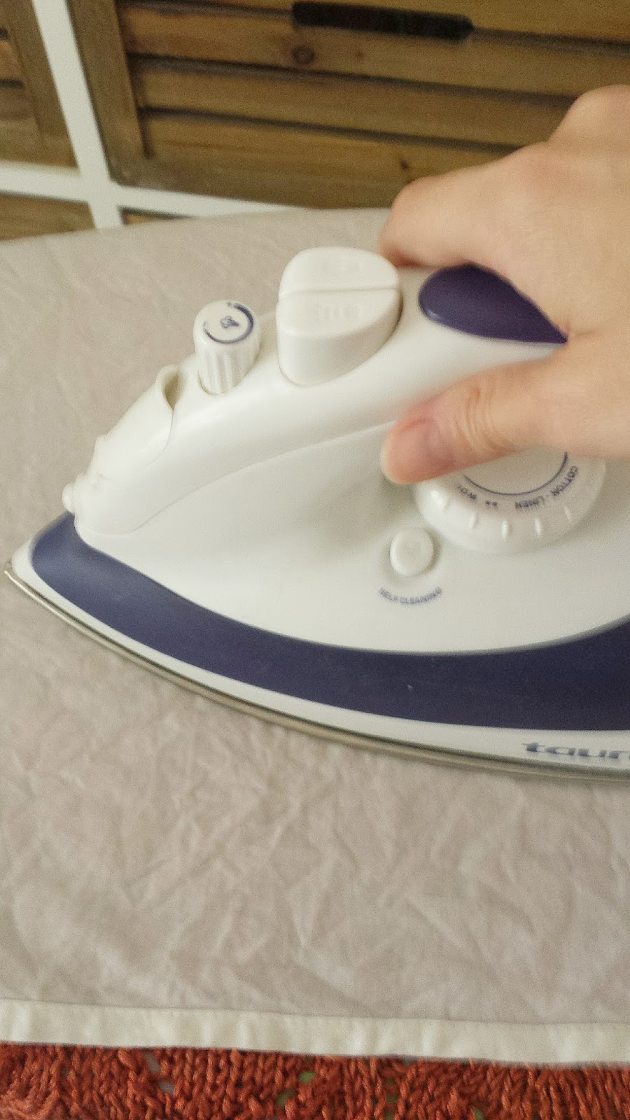 Lo único que hace falta para el cambio es una tela (yo uso una servilleta de algodón) mojada y escurrida. Se pone sobre la camiseta y se pasa la plancha a una temperatura adecuada para la fibra con la que hayamos trabajado. Yo no suelo casi ni apoyar la plancha sobre la tela porque no me gusta que el punto se aplaste, así que, se va pasando la plancha casi  sin apoyar por encima del paño mojado esperando que suelte vapor. Con paciencia se va “planchando” toda la prenda.