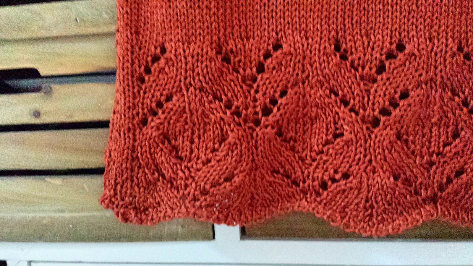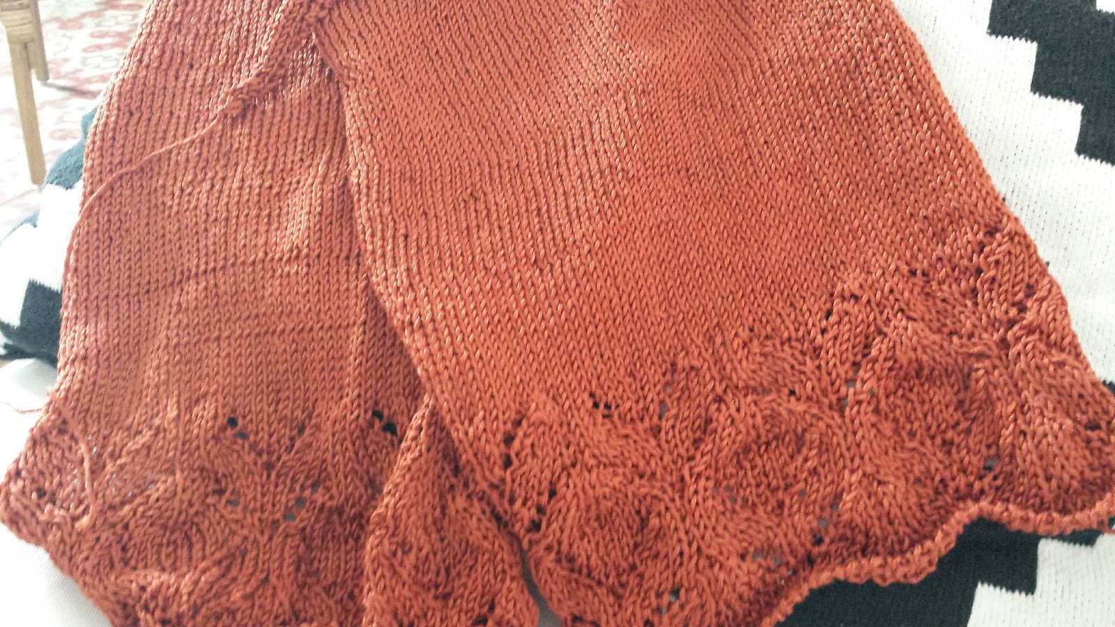Lo primero era elegir un calado para la parte de abajo de la camiseta, así que me puse a buscar por internet y encontré varios cantidatos. Decidí probar con uno de hojitas que veía mono, pero después de tejerlo no me convenció nada, lo que solo puede significar una cosa…¡¡a deshacer!!