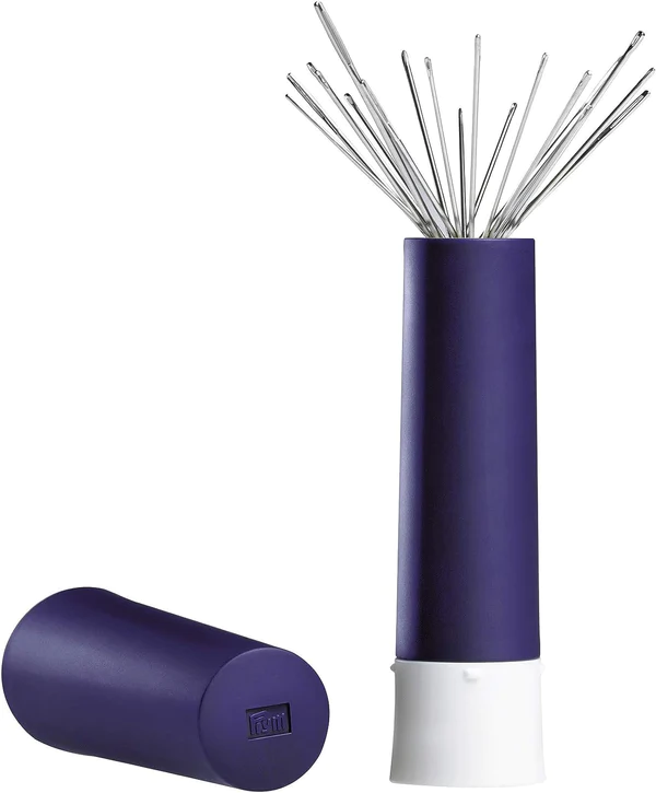 Es una cajita en forma de tubo que, con una rueda giratoria e imán en la parte inferior, te permite sacar y guardar tus agujas fácilmente en su interior.