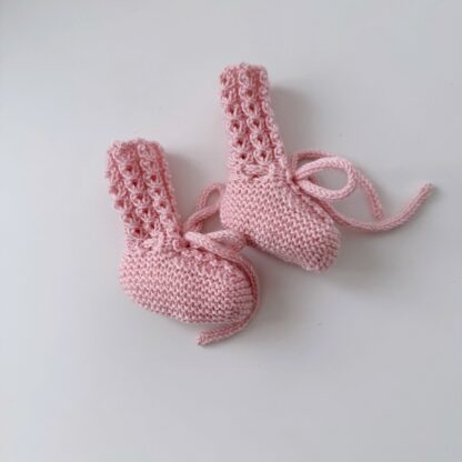Los Patucos Libélula están tejidos siguiendo al estructura básica de los patrones de patucos. Están empezados por la suela a punto bobo y un adorno a punto de ochitos en el centro del empeine y en toda la caña, haciendo juego con el resto de prendas del Conjunto Libélula. Son patucos altos y llevan en la parte del tobillo cordón de la misma lana para abrocharlos y que aguanten más tiempo en el pie del bebé.